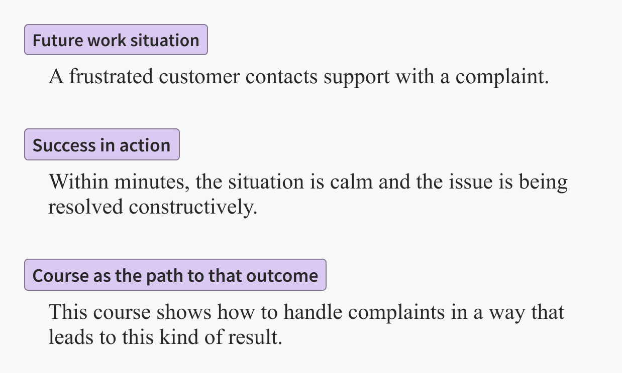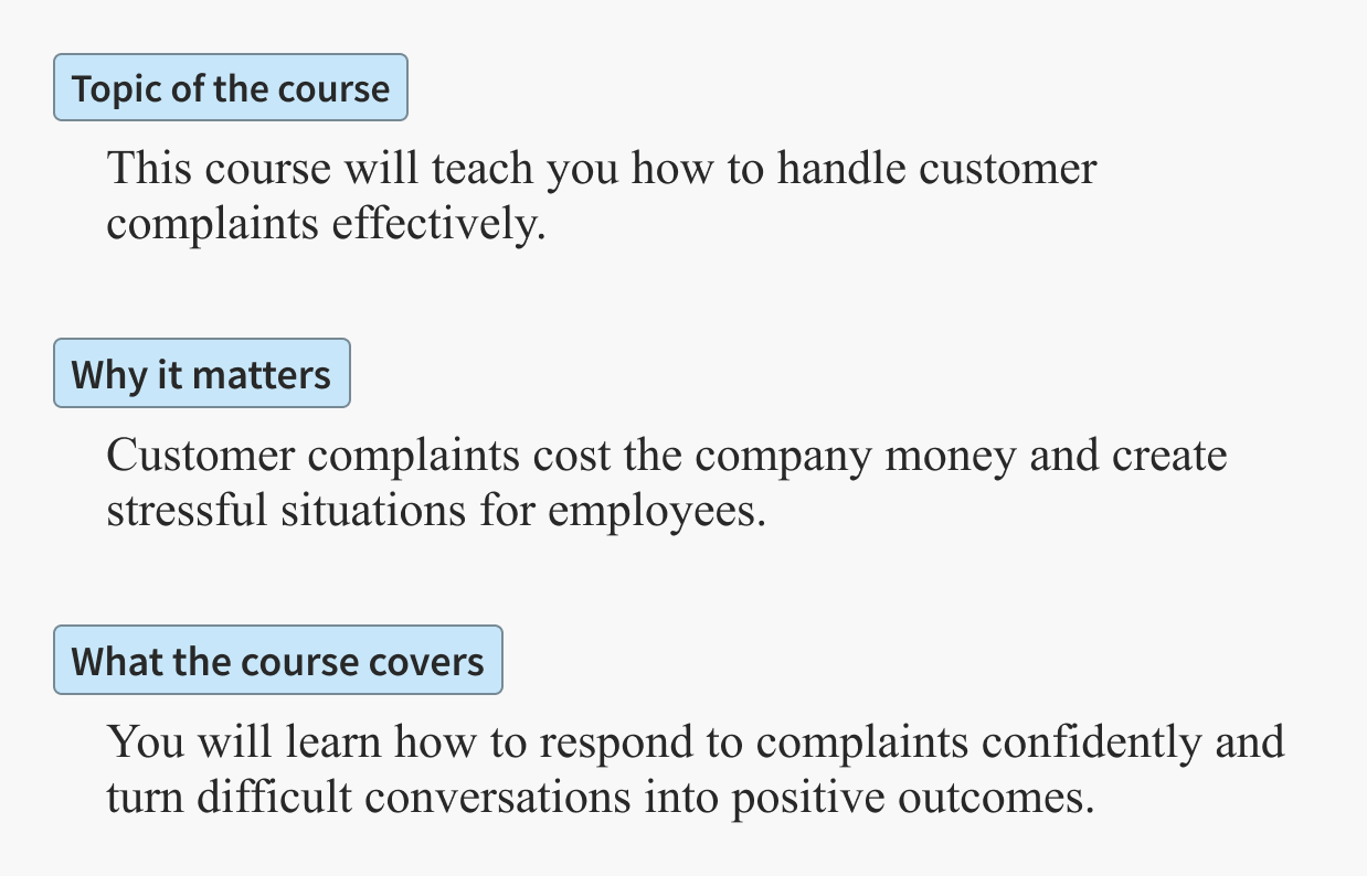 Skill-based courses work especially well with this approach, particularly when the value of the topic can be expressed through clear capabilities or performance improvements.