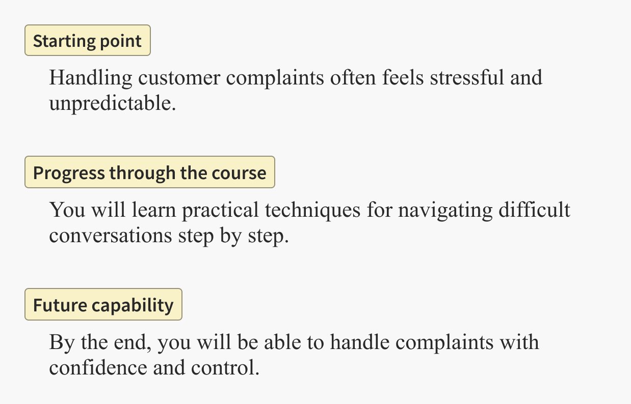 Present the course as a progression from the learner’s current situation to a more capable future state. Rather than listing topics, frame the course as a structured path that helps the learner move from where they are today to where they need to be.