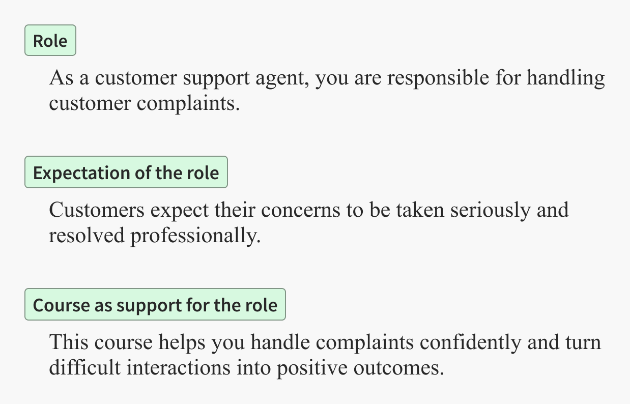 Responsibility-driven topics often work well with role-based framing. Anchoring the opening in the learner’s role helps connect the course directly with expectations they already have in their work.