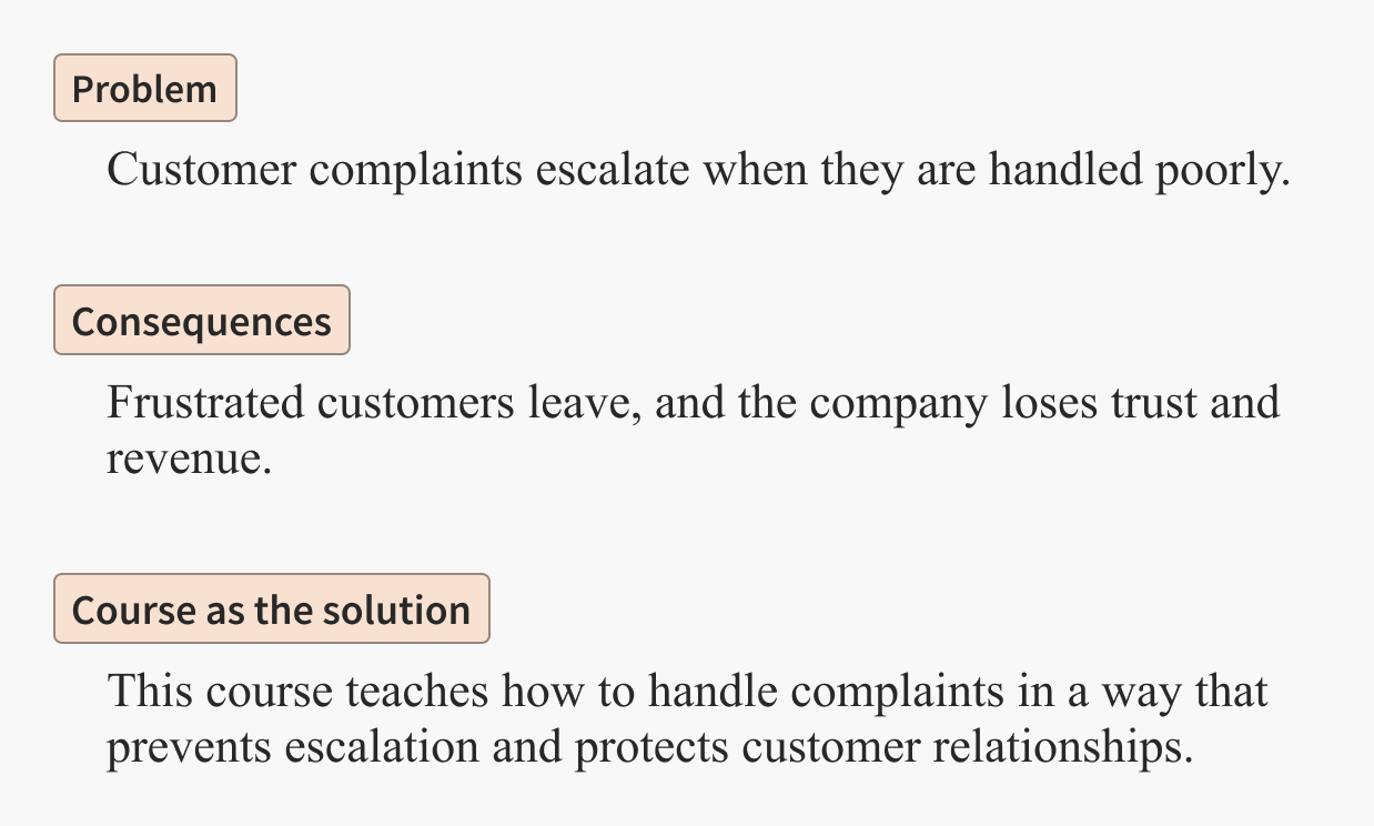 Start by highlighting what the learner will be able to do after completing the course. Instead of describing the content, focus on outcomes and position the course as the path to achieving those results.