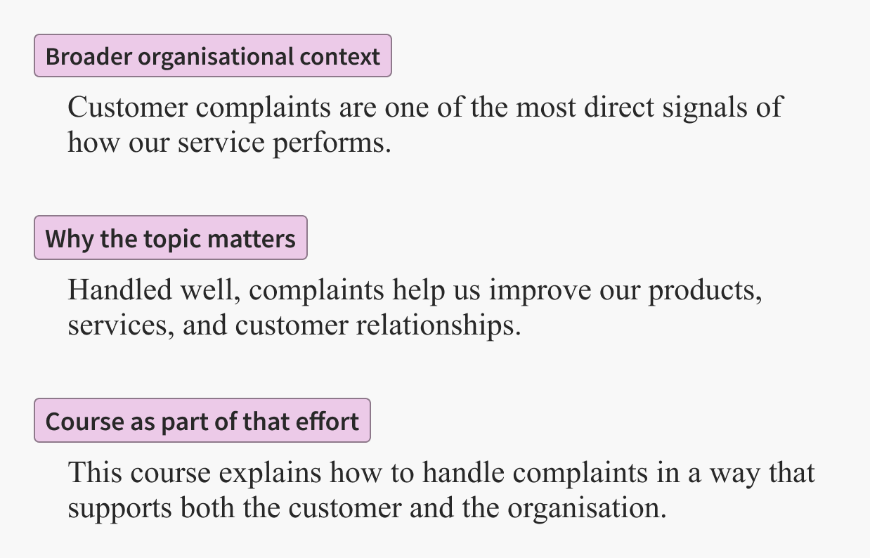 There is no single correct way to open a course. Different topics and learning situations call for different framing. Sometimes it makes sense to start with the results the learner will achieve. In other cases, it may be more effective to begin with a professional responsibility, a practical problem, or the broader context of the topic.