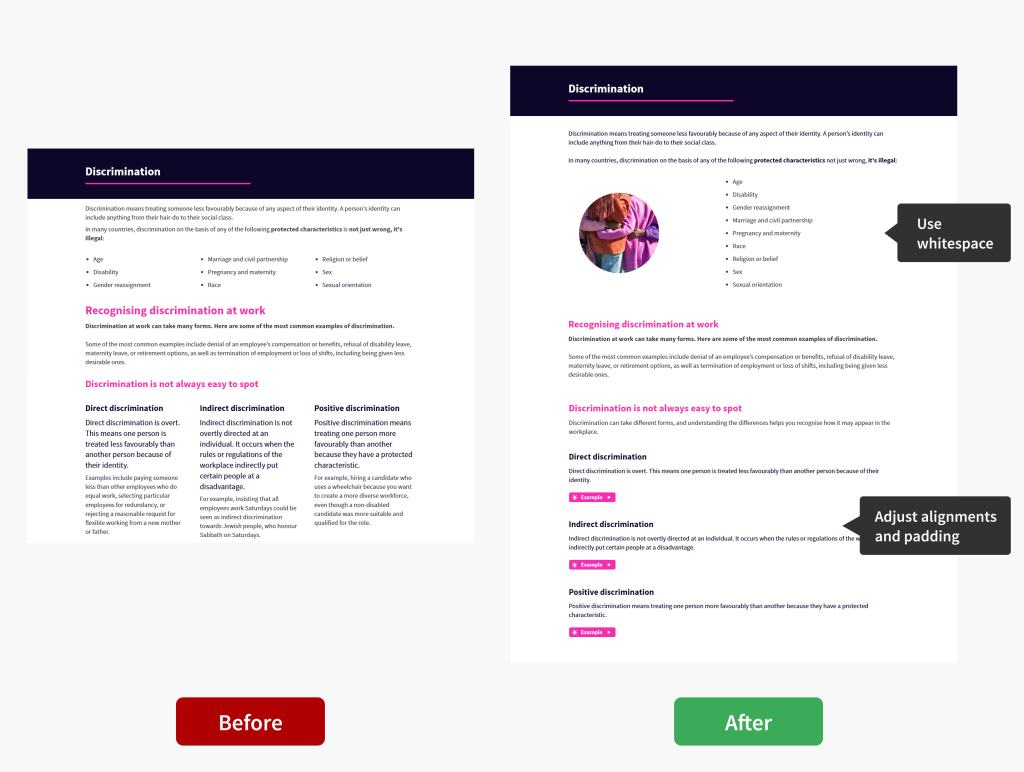 Breaking long blocks of text into bite-sized chunks makes content feel more manageable and gives learners a sense of progress.