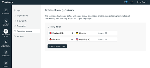 When creating multilingual courses, consistency becomes even harder to maintain. The translation glossary lets you define translation rules for key terms, improving accuracy and ensuring that important concepts are translated consistently across languages.