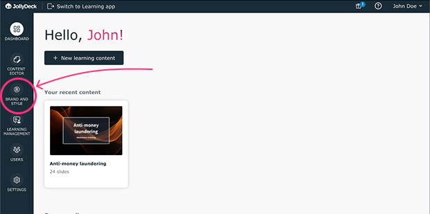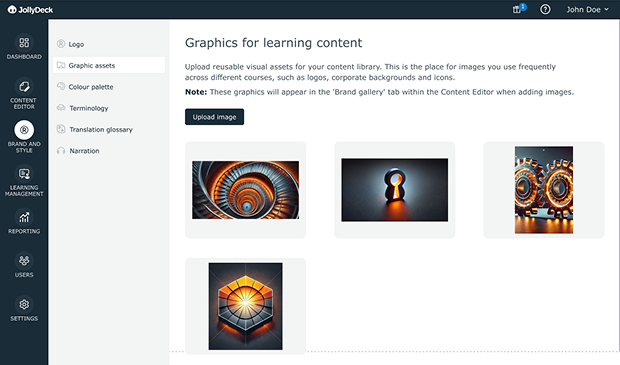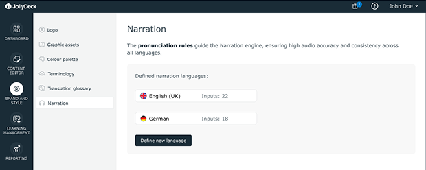 All branding-related configuration is now grouped under a single functionality in JollyDeck. Branding is defined once and reused across all content, editors, languages, and output formats. Instead of adjusting settings repeatedly for each course, you manage them centrally and apply them consistently throughout your entire e-learning catalogue.