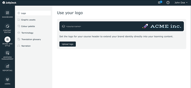 Logo can now be managed centrally and applied consistently wherever learning content is consumed. You can replace the JollyDeck logo with your own in the SCORM player and display your logo in the header of shared links or embedded learning content. This ensures clear brand ownership regardless of how or where learners access the course