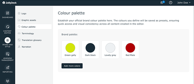 Brand colours no longer need to be applied manually or redefined for every project. You can create custom colour palettes that reflect your brand and use them consistently throughout the JollyDeck editor. This helps keep visual styling aligned across courses, even when multiple authors are involved.